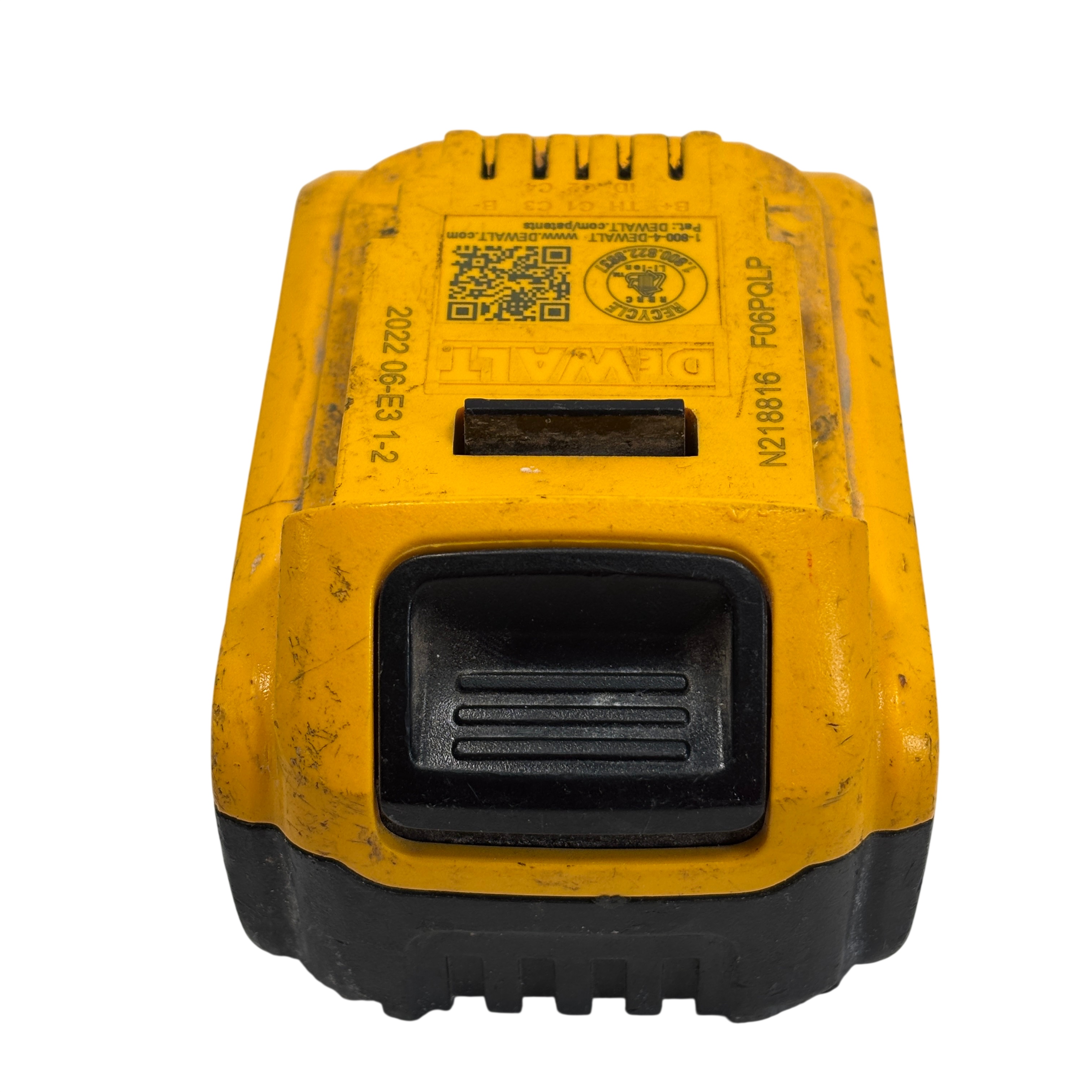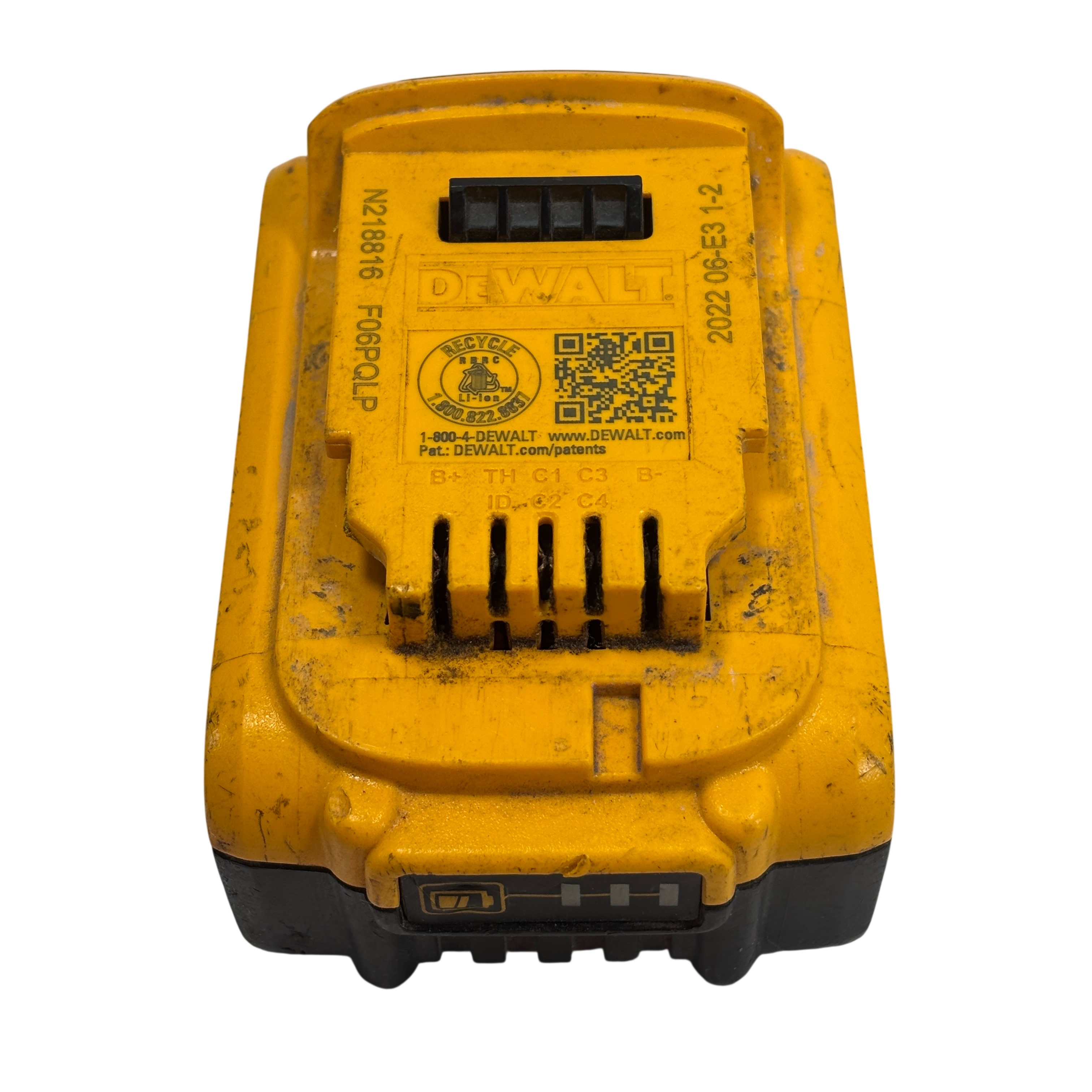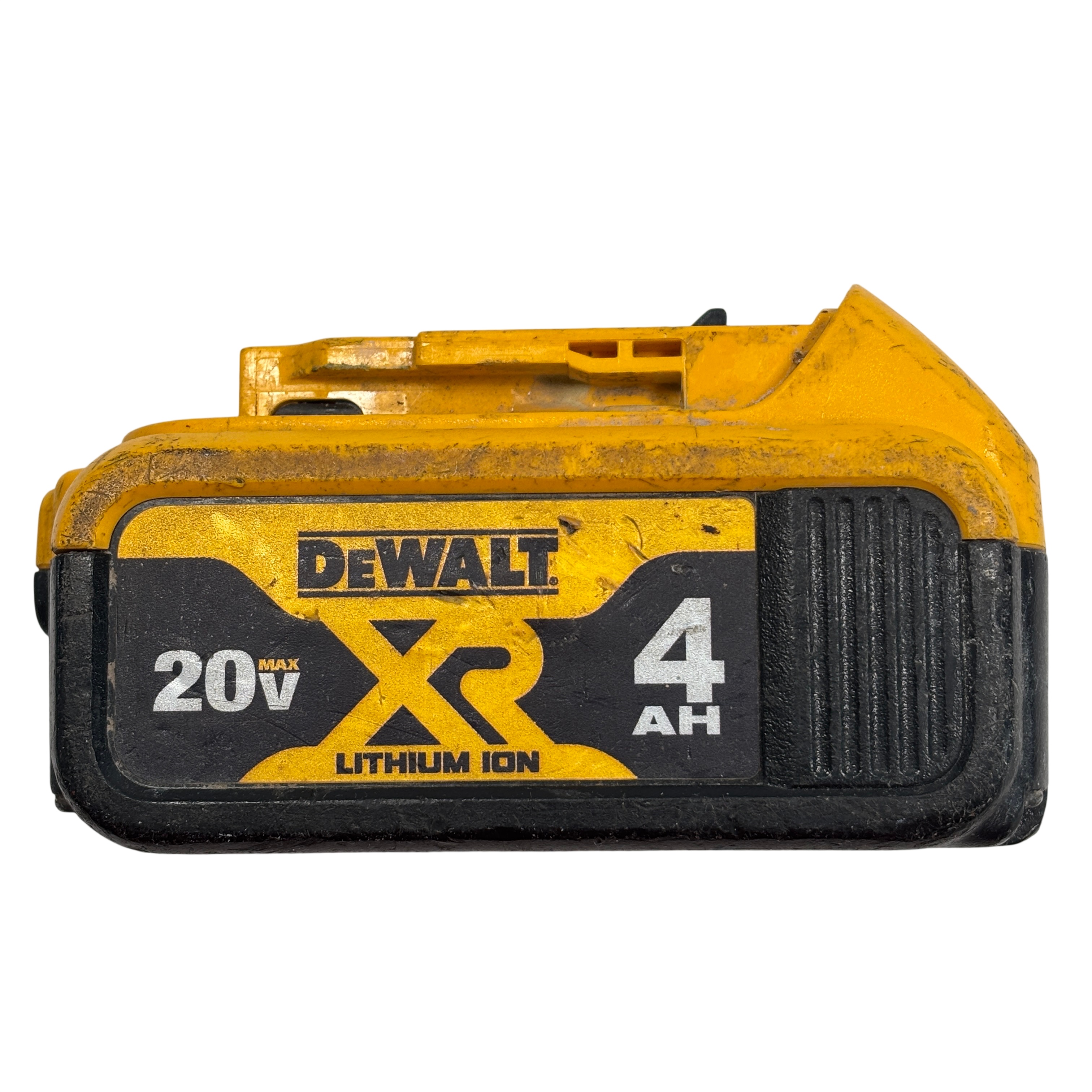 This DeWalt battery pack is previously owned and it is overall in fair condition. The battery has been tested and it works. The battery is covered with dirt stains, black marks, and scratches from past use. See photos for details.