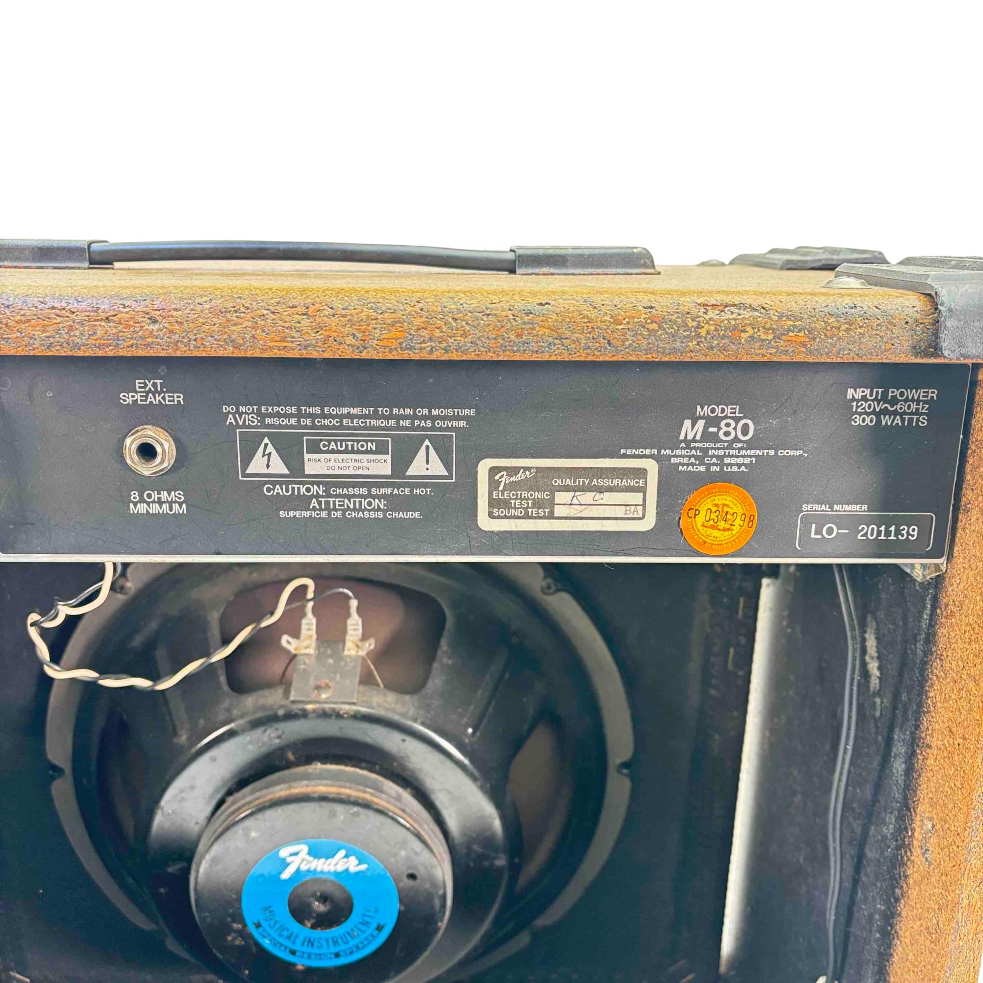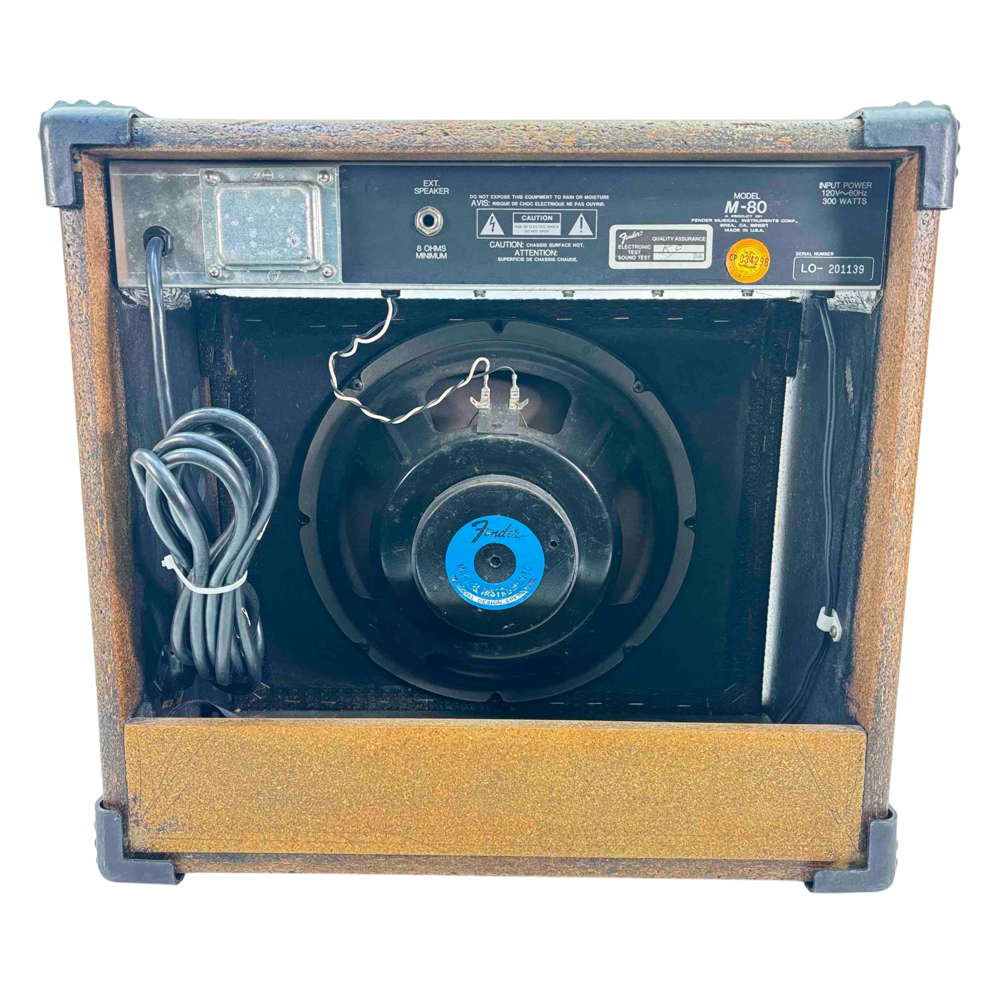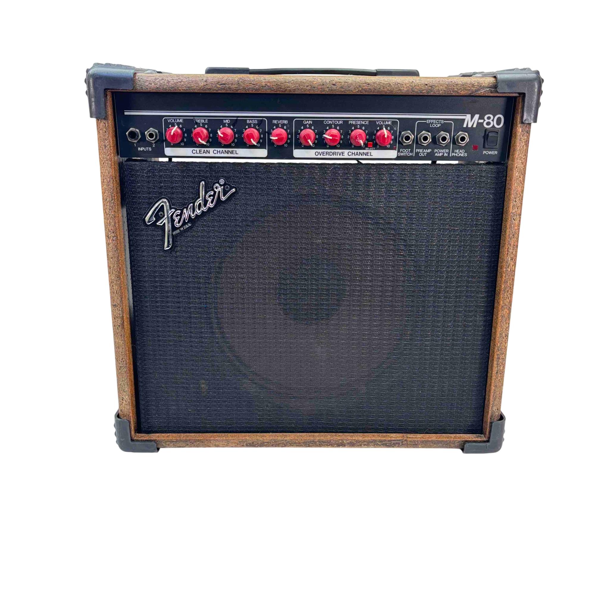 Unleash the full potential of your guitar with the classic Fender M-80 Guitar Amplifier Combo, featuring sleek black corners and captivating red knobs. Renowned for its powerful 300-watt output and made with quality assurance by Fender, this US-made amplifier brings exceptional clarity and depth to every note you play. Whether youre rocking out at a gig or practicing in your garage, the Fender M-80 delivers reliable performance with a rich, dynamic sound thats hard to beat.