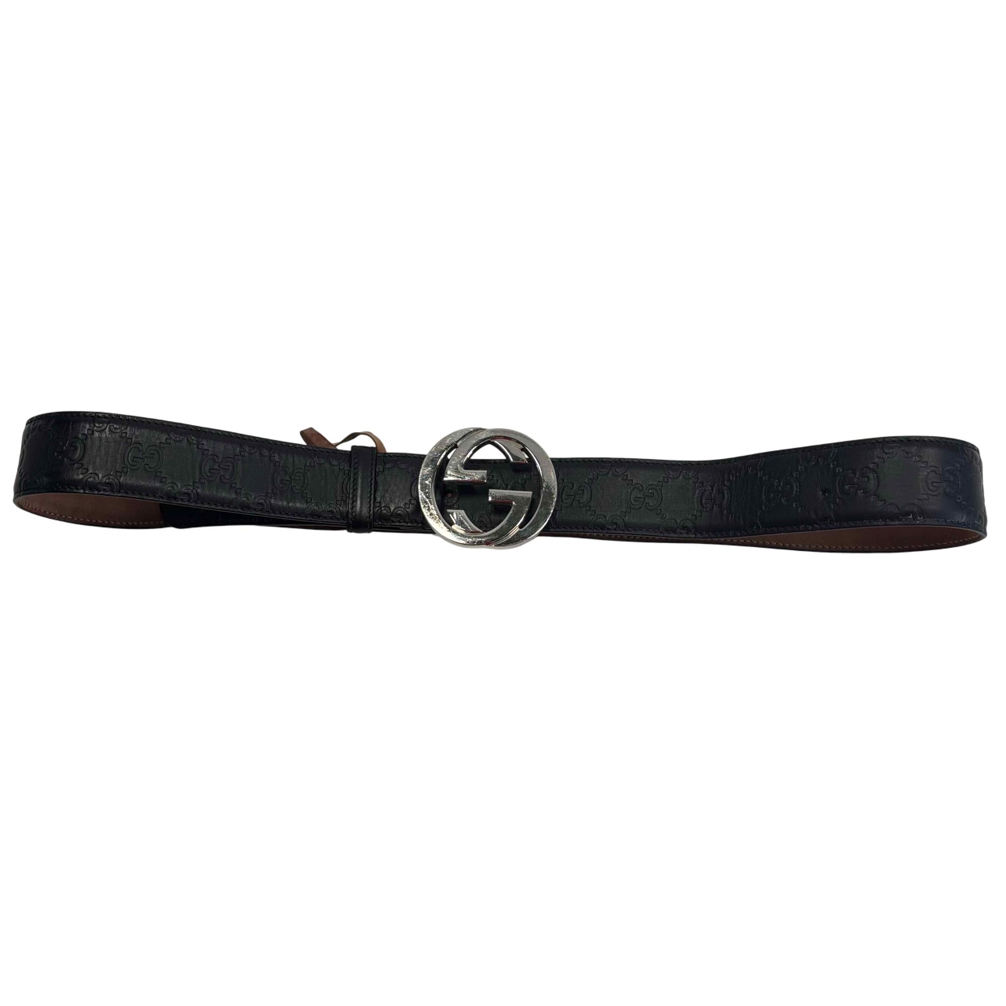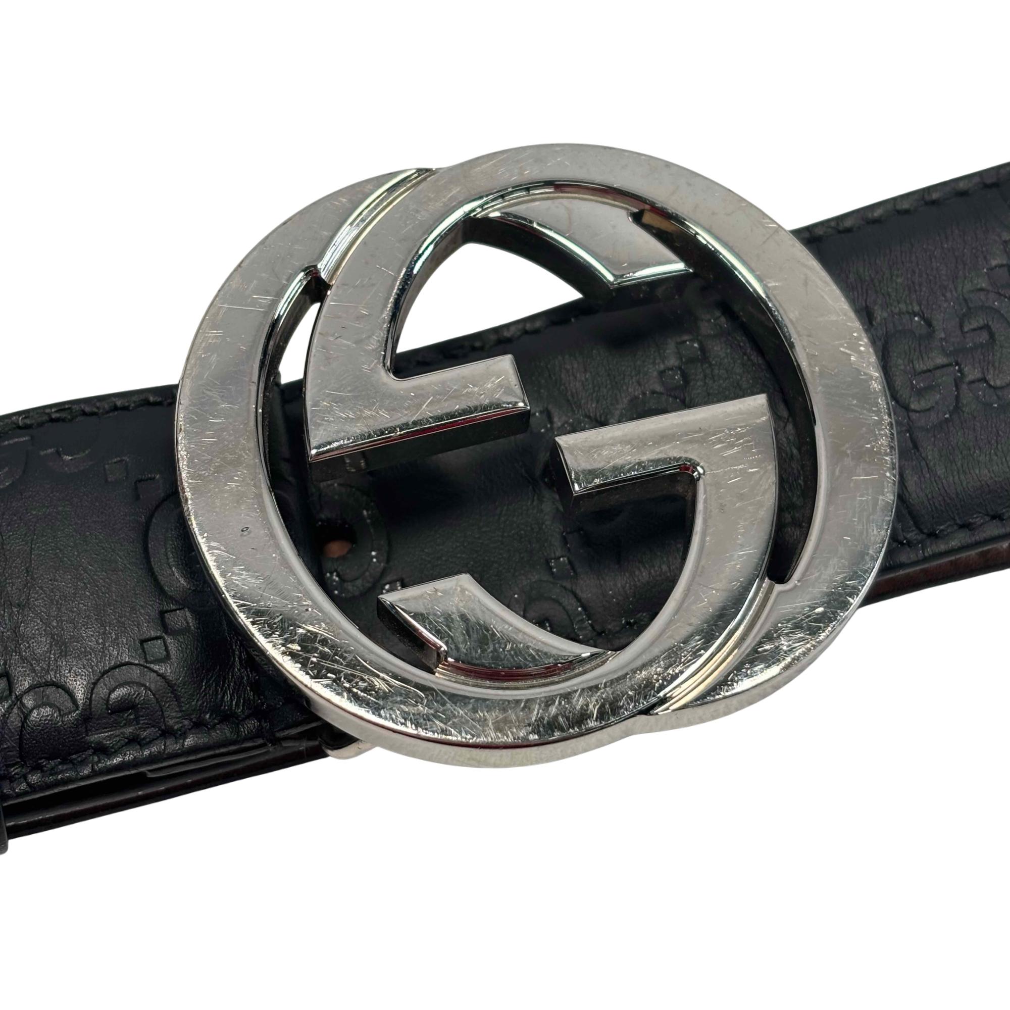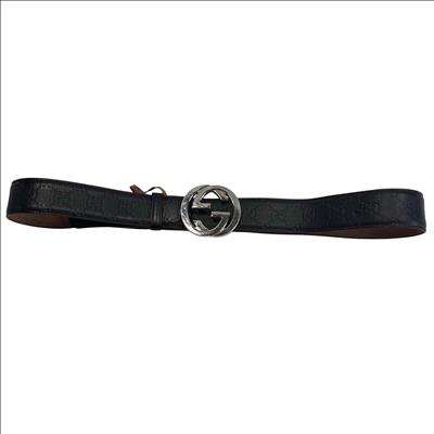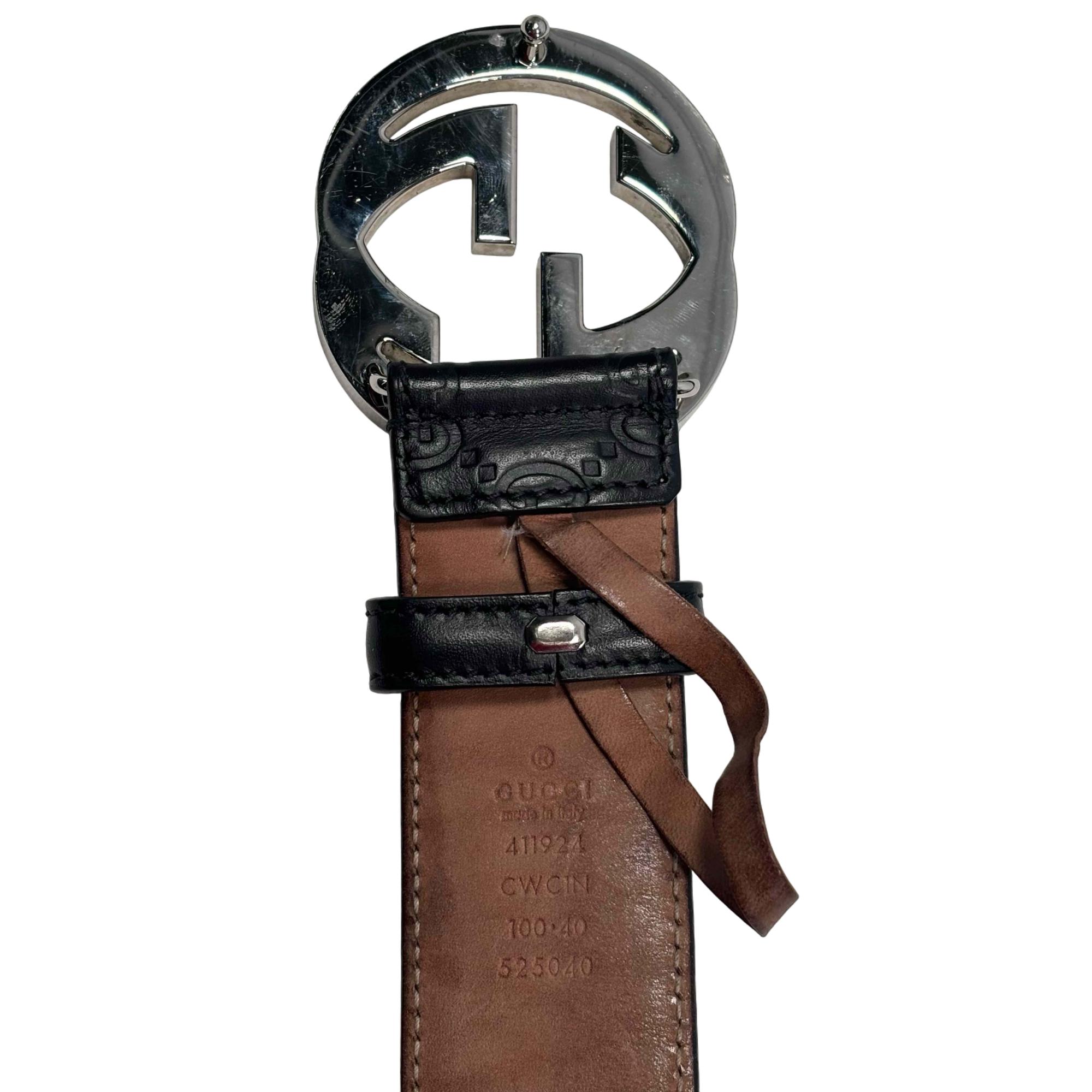 The Gucci Interlocking G Buckle Black Leather Belt 411924 CWC1N 10040525040 features premium leather with a distinctive black finish and a polished silver-colored interlocking GG buckle. Expertly crafted for a sophisticated look, this designer belt combines luxury materials with iconic style, making it a versatile accessory for contemporary fashion.