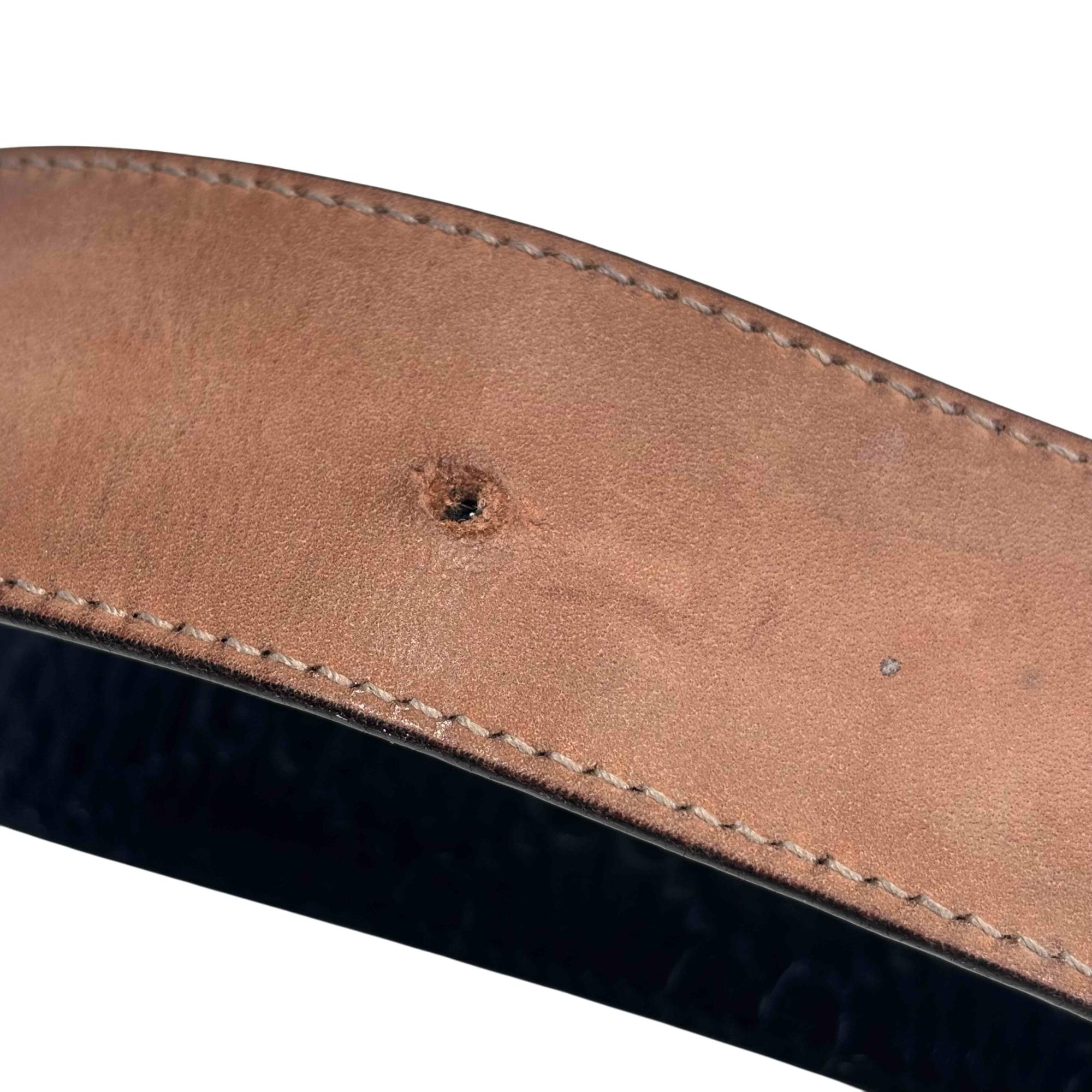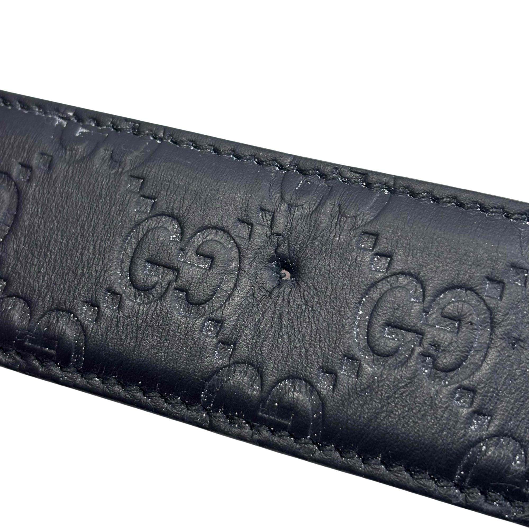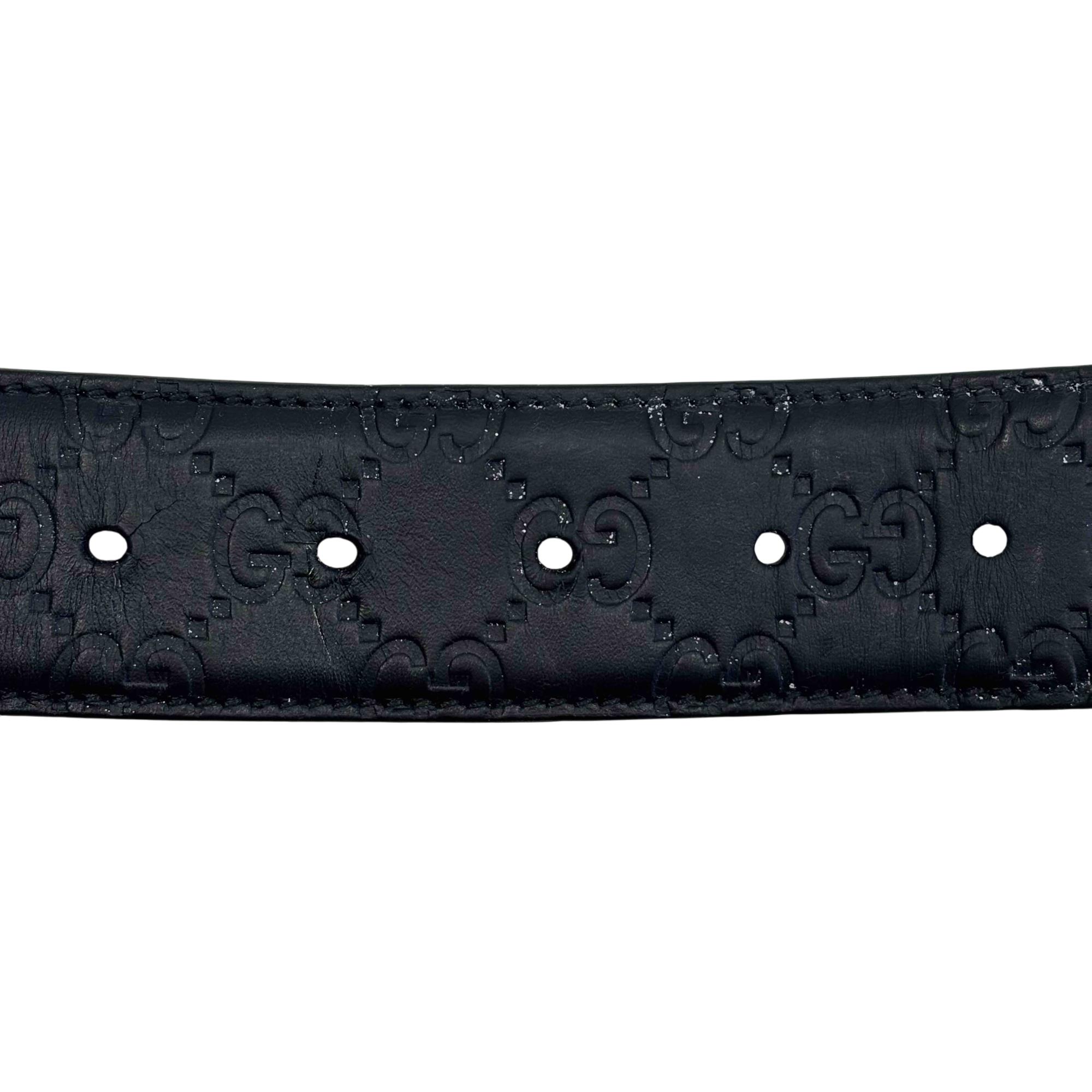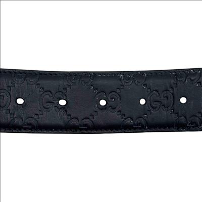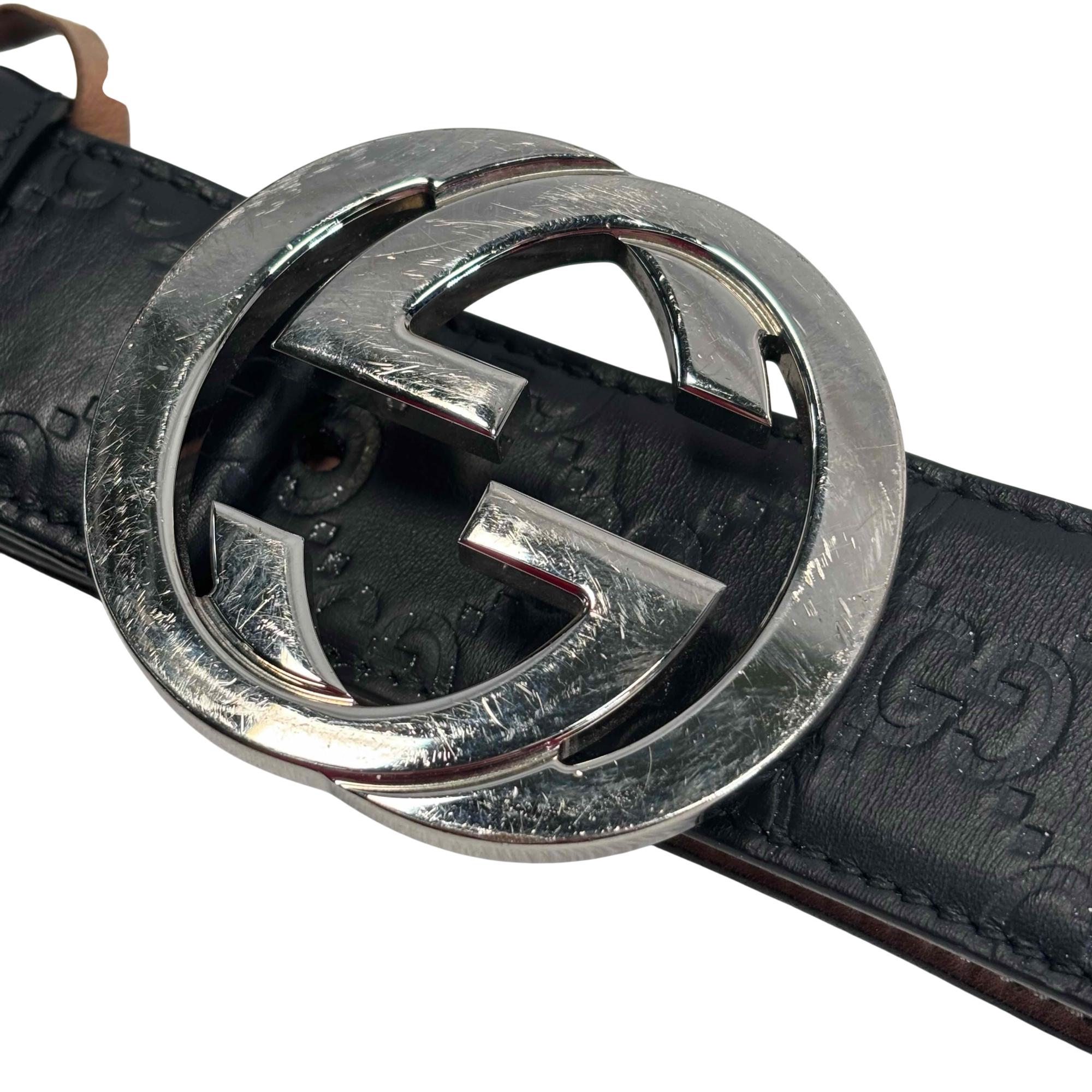 The Gucci Interlocking G Buckle Black Leather Belt 411924 CWC1N 10040525040 features premium leather with a distinctive black finish and a polished silver-colored interlocking GG buckle. Expertly crafted for a sophisticated look, this designer belt combines luxury materials with iconic style, making it a versatile accessory for contemporary fashion.