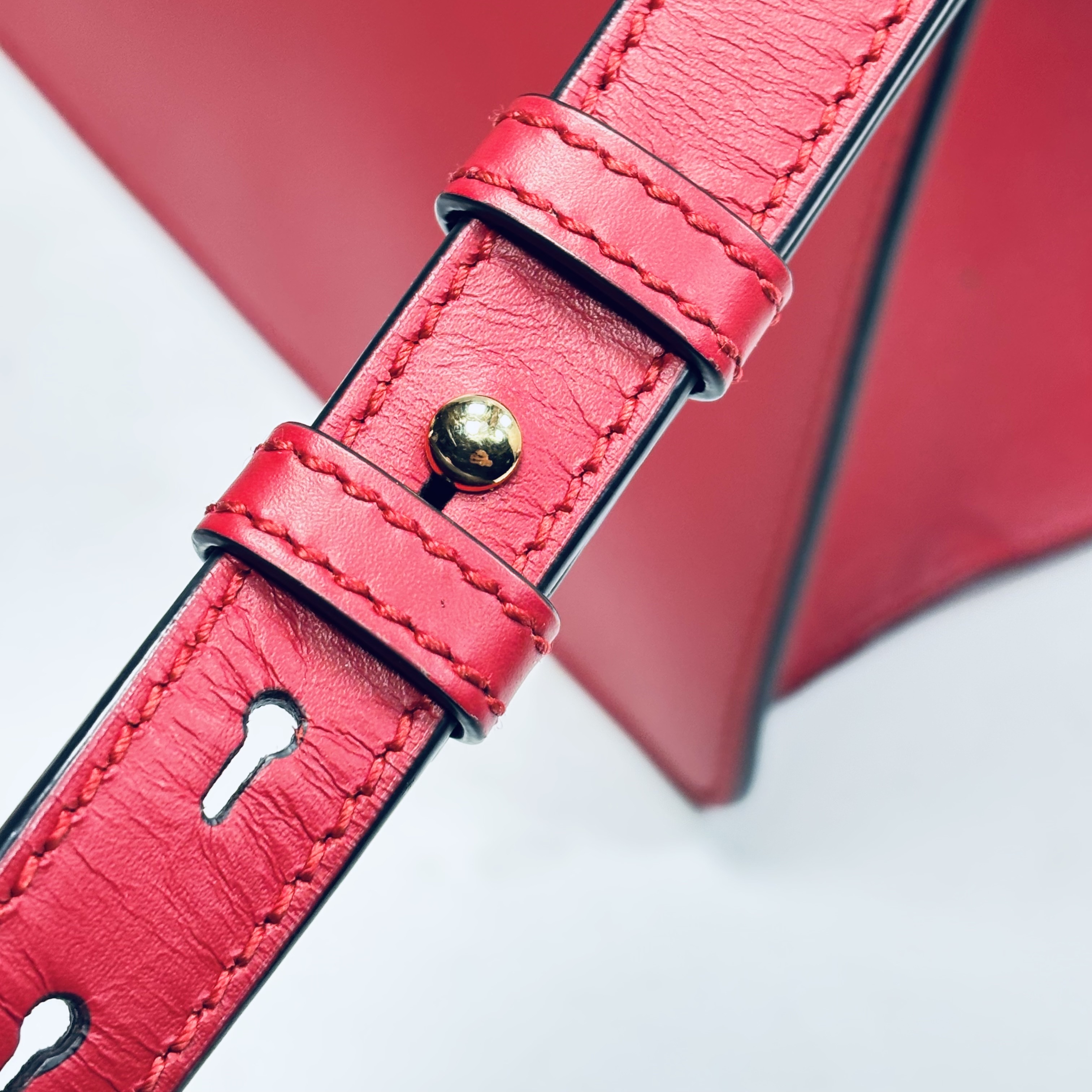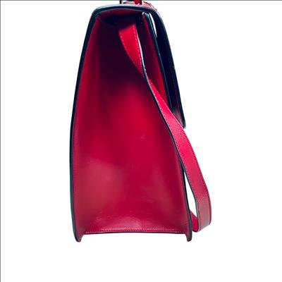 Red with black and red striped fabric and gold-tone chain detail