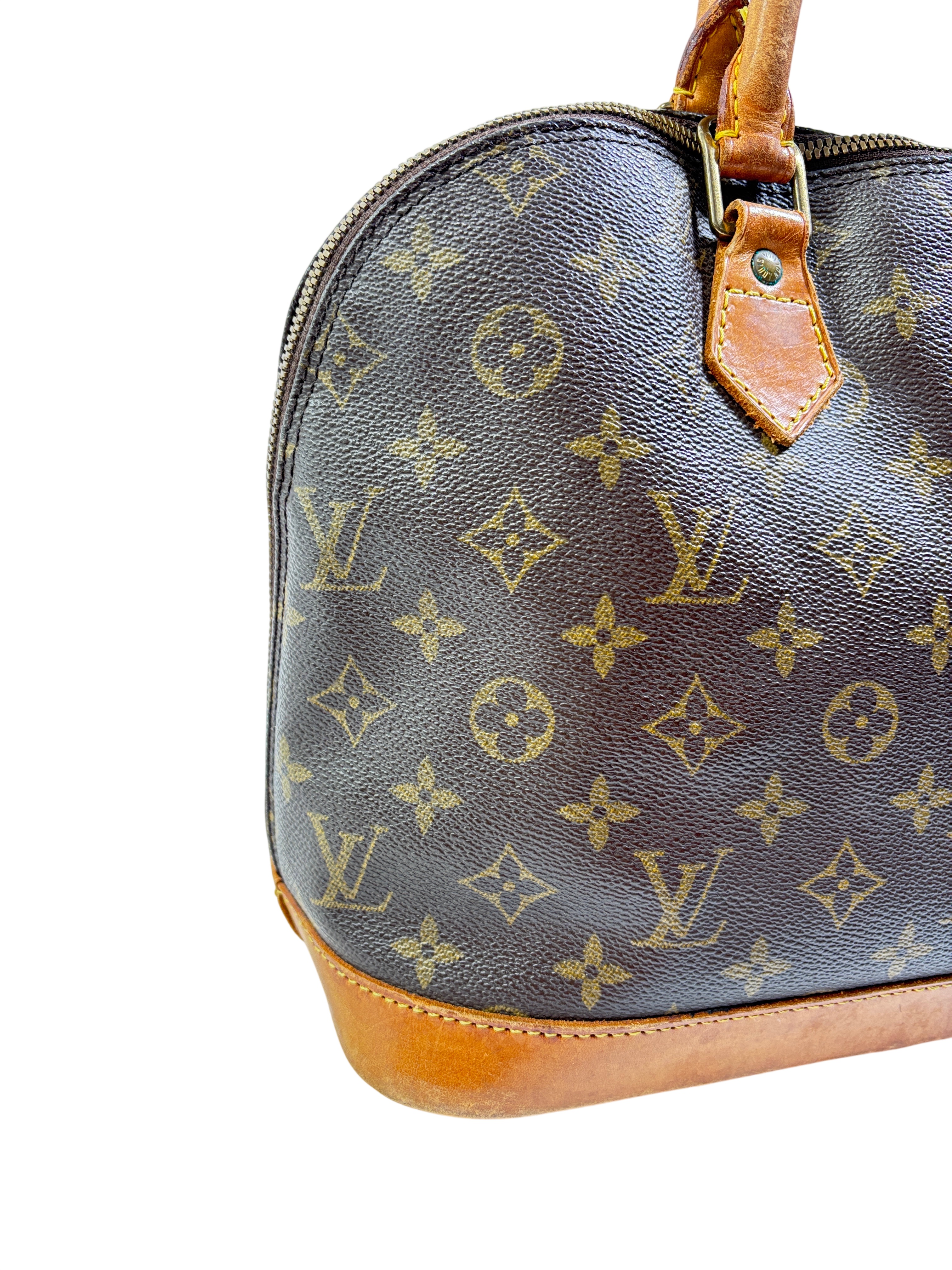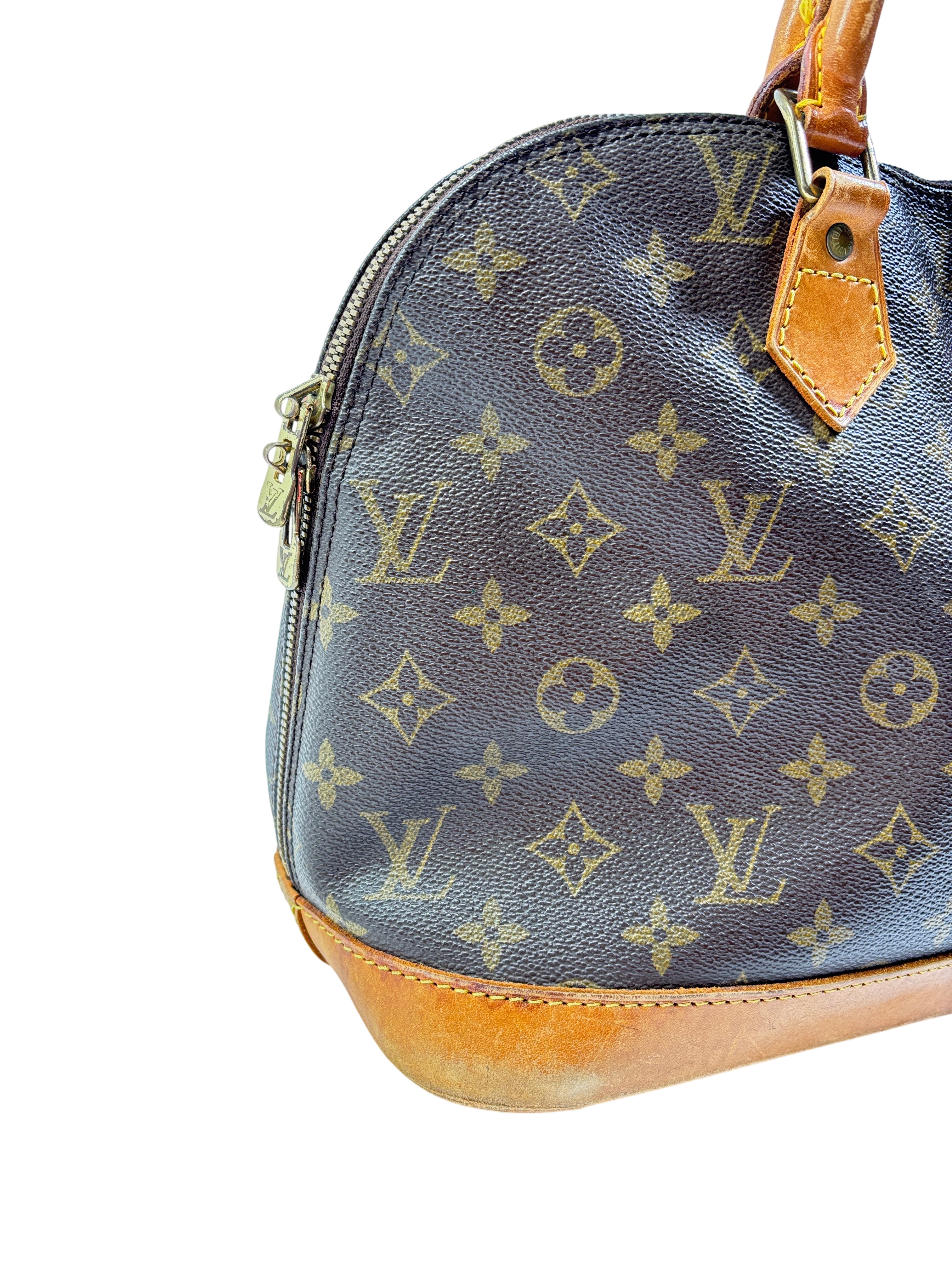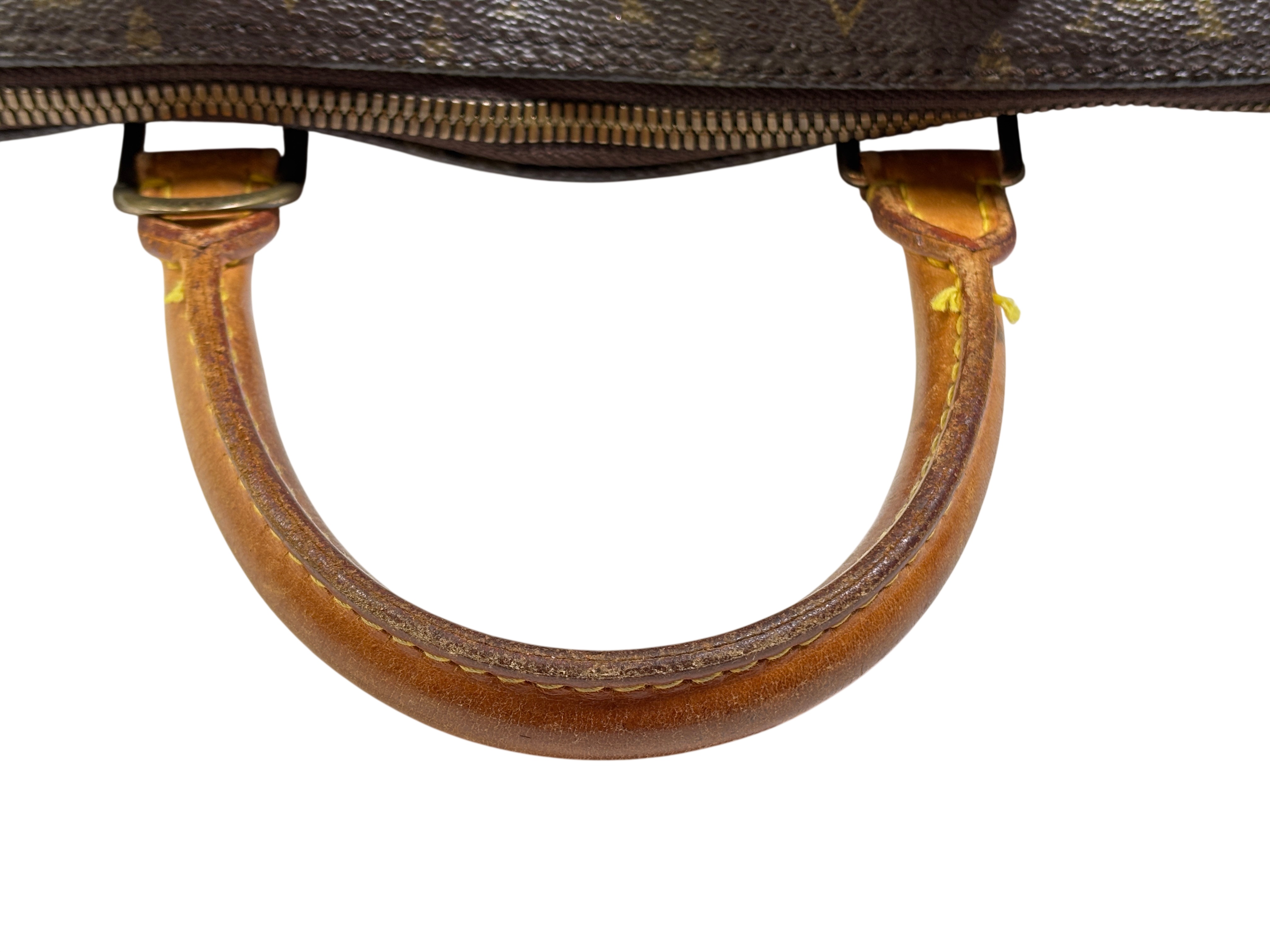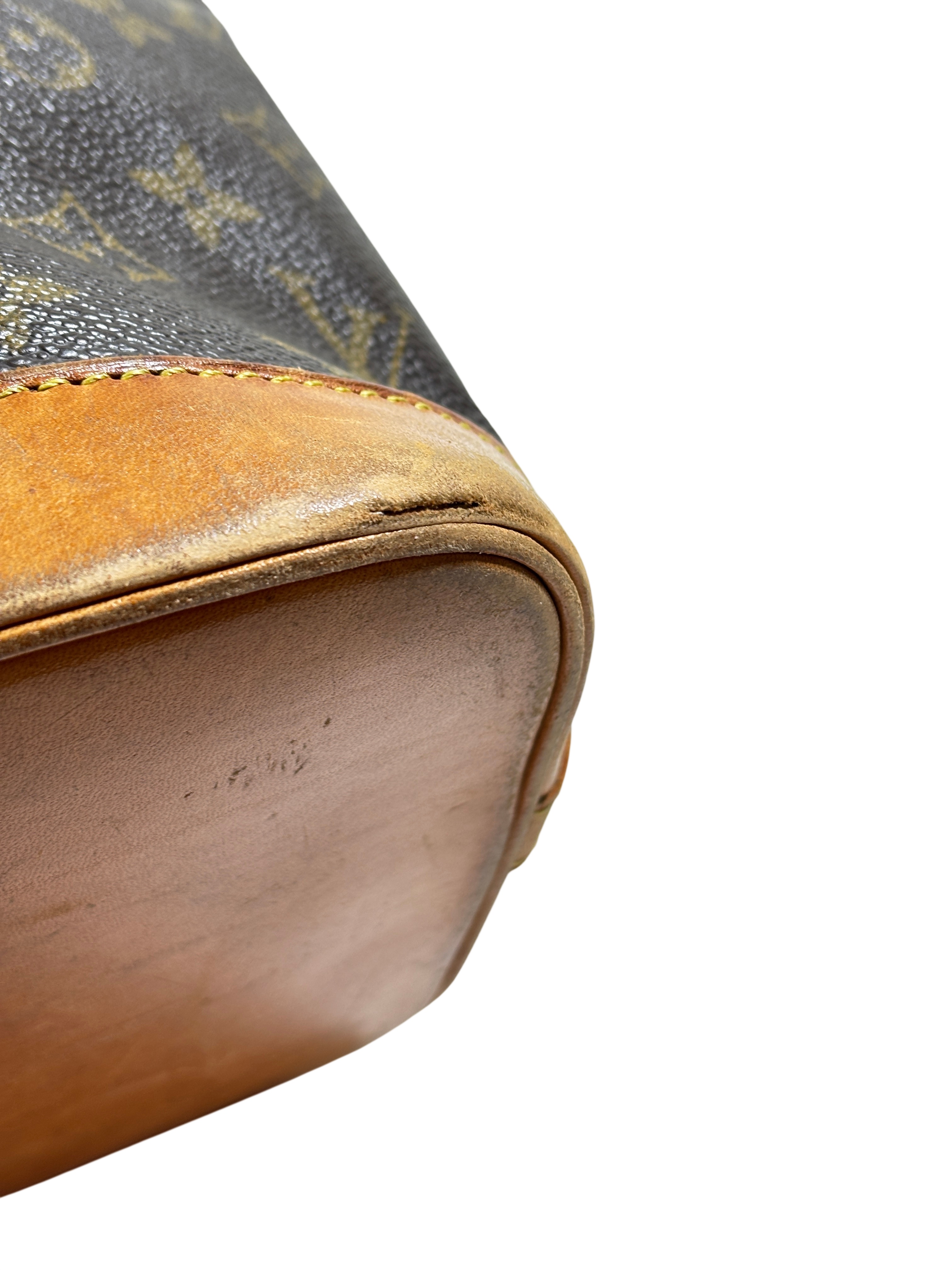 This bag has been previously owned. It has scuffs, scratches, and heavy rubbing on the bottom corners. The handles are creased. The hardware has scratches but remains bright and shiny. The interior lining has stains from previous use. See pictures for details.