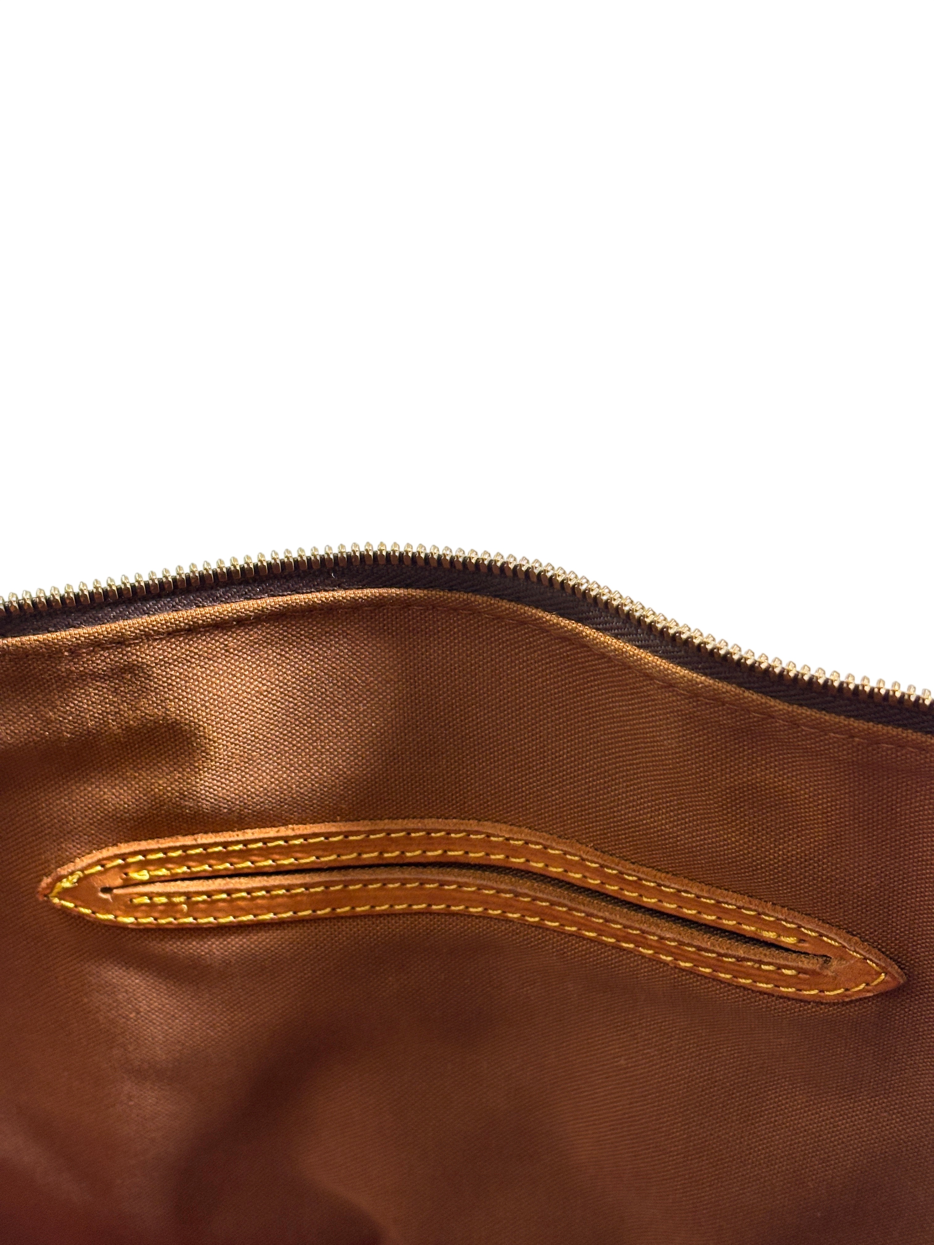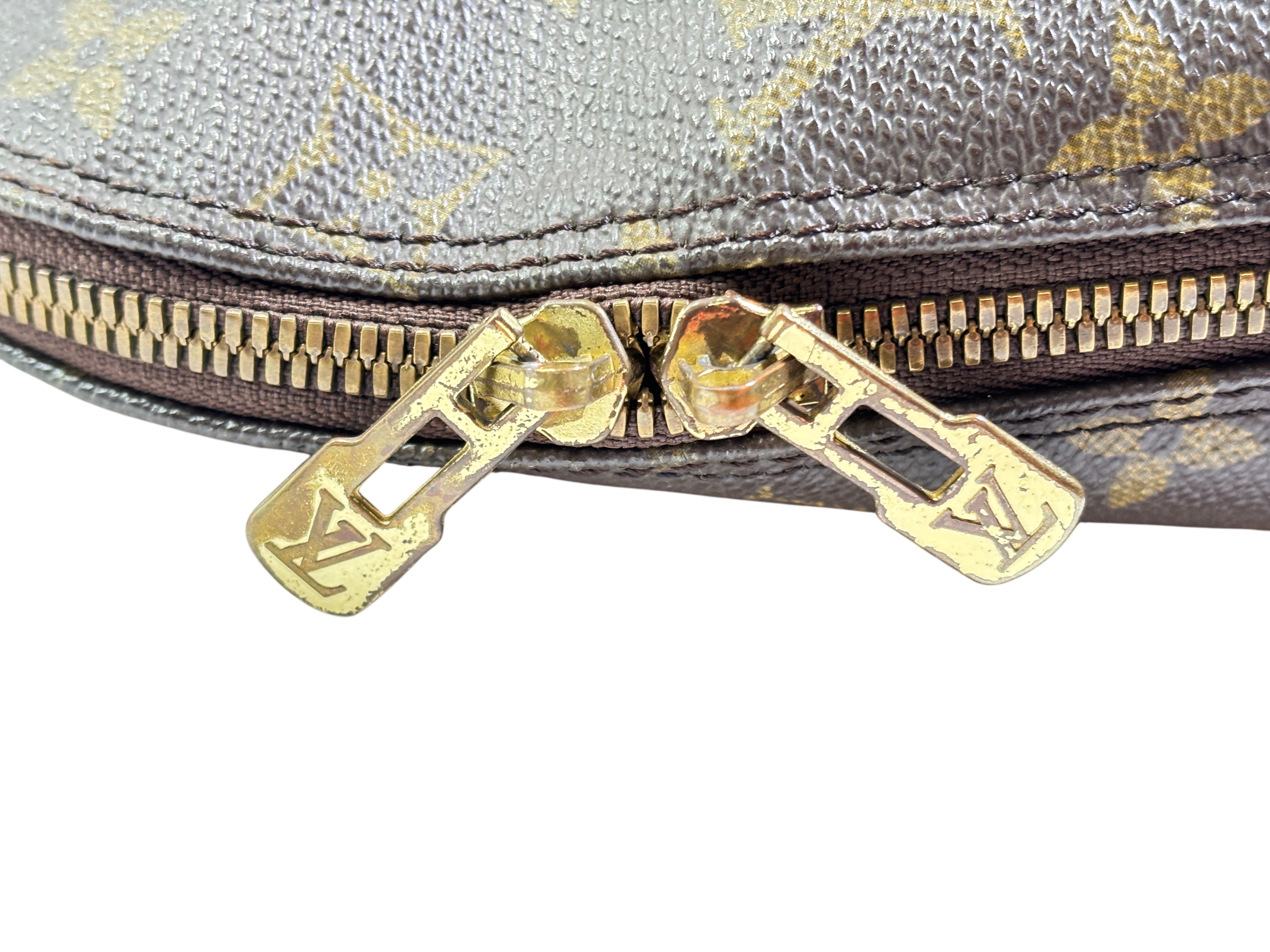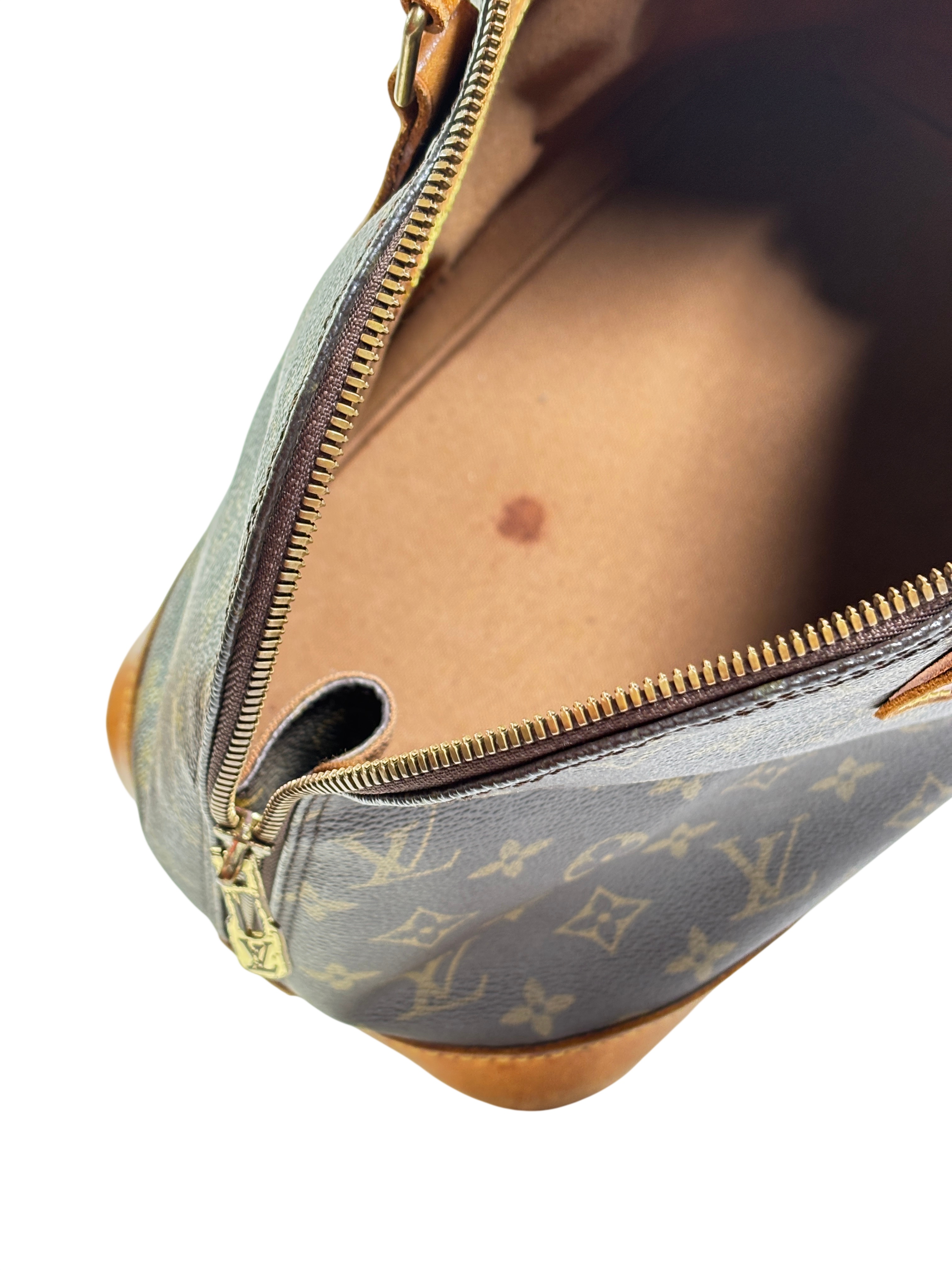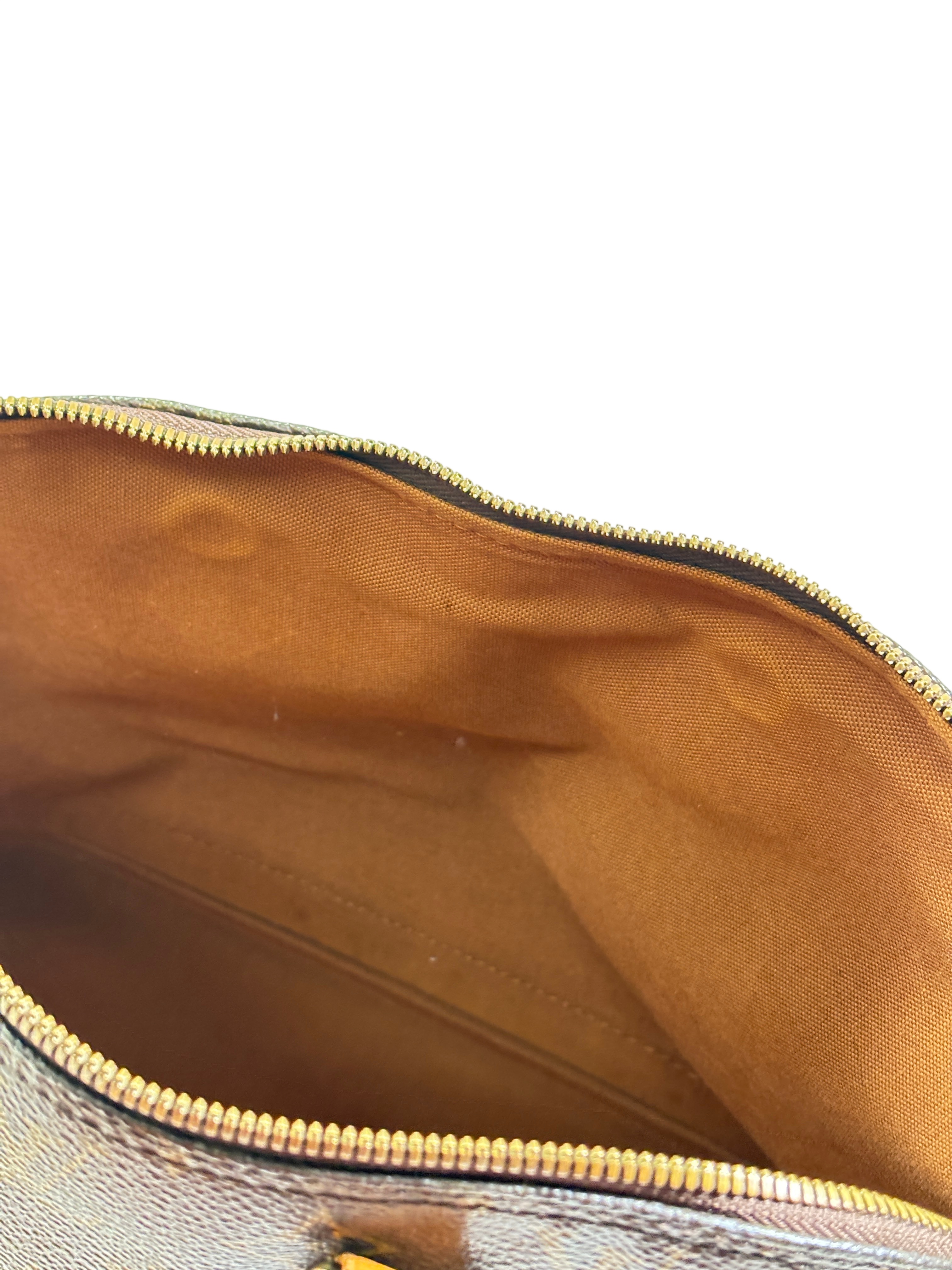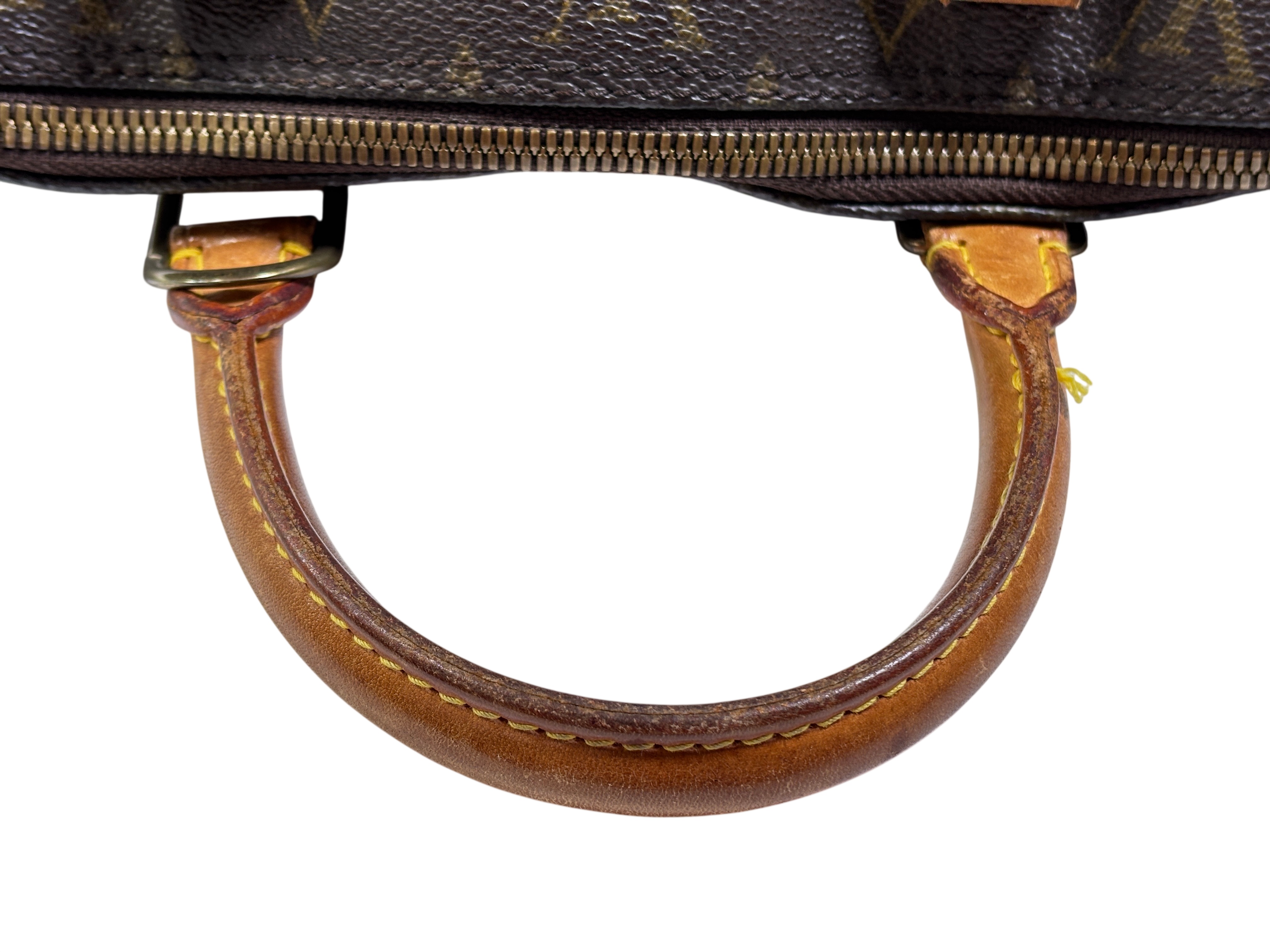 This bag has been previously owned. It has scuffs, scratches, and heavy rubbing on the bottom corners. The handles are creased. The hardware has scratches but remains bright and shiny. The interior lining has stains from previous use. See pictures for details.